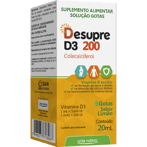Desupre 200UI é um suplemento de vitamina D3 (colecalciferol) em gotas, indicado para auxiliar na reposição dessa vitamina essencial no organismo. A vitamina D3 desempenha papel fundamental na absorção de cálcio e fósforo, contribuindo para a saúde dos ossos, dentes e músculos, além de apoiar o funcionamento do sistema imunológico. A apresentação em gotas permite uma dosagem prática e precisa, facilitando o uso diário para crianças e adultos, conforme orientação médica. Benefícios