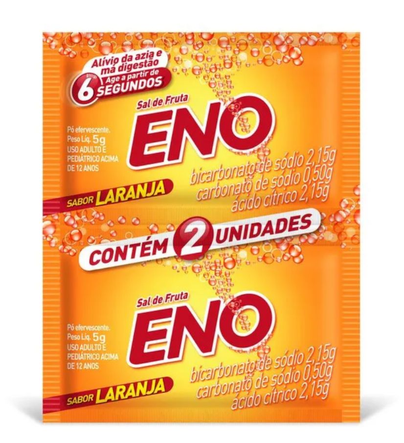 | Sal de Fruta Eno tradicional com 2 envelopes de 5 g é indicado para o alívio rápido da azia má digestão e desconforto estomacal sua fórmula efervescente age rapidamente no organismo ajudando a neutralizar a acidez e proporcionando sensação de bem estar em poucos minutos prático e fácil de usar pode ser levado para qualquer lugar sendo uma solução eficiente para momentos de desconforto após refeições pesadas ou excessos alimentares |